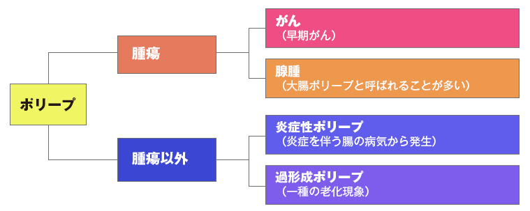 大腸ポリープは大きく腫瘍性ポリープと非腫瘍性ポリープに分かれます。腫瘍性ポリープには良性の腫瘍である「腺腫」と悪性の腫瘍である「がん」があります。この良性腫瘍である「腺腫」は大腸ポリープの8割以上を占める最も多いポリープです。また非腫瘍性ポリープにはまったくの良性である「過形成ポリープ」や「炎症性ポリープ」などがあります。