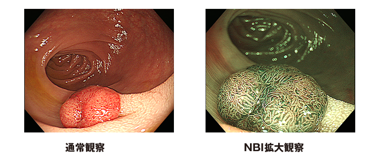 通常の観察でもある程度は診断可能ですが、青い色素を病変に散布して内視鏡で観察する「色素内視鏡検査」という方法や、表面の構造がわかりやすくなる特殊な光を当てて内視鏡で病変を拡大観察する「NBI拡大観察」といった方法で、ポリープを切除しなくてもその種類を診断することができます。