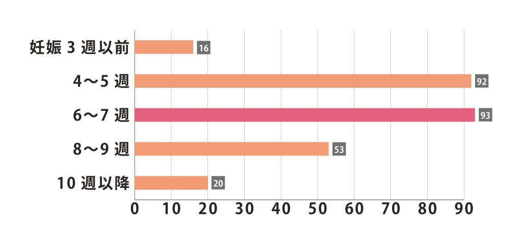 赤ちゃん用品メーカー「コンビタウン」が行った、つわりの時期に関するアンケート調査でも、「4~5週」「6~7週」の上位2つの最も多い回答結果が、一般的にいわれているつわりが始まる時期と重なります。