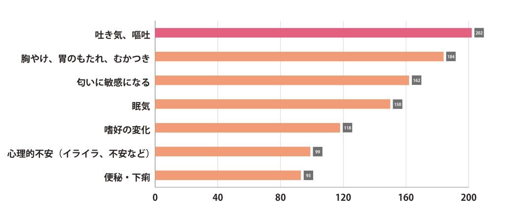 上記の「コンビタウン」によるアンケート調査で挙げられた上位5つの症状は、次の通りです。「吐き気、嘔吐」「胸やけ、胃のもたれ、むかつき」は、吐きづわりに該当します。