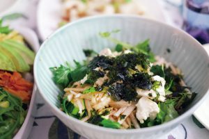 切った野菜と豆腐と、適度に切った「ワカメ」をまぜ、ごまドレッシングを合わせましょう。