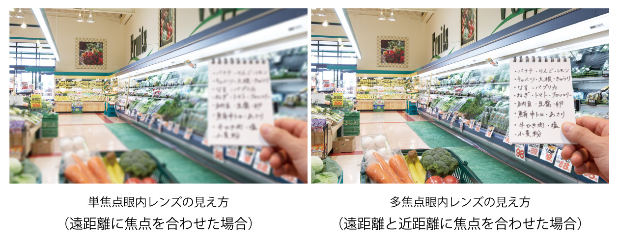 白内障の手術により、見える映像は鮮明になりますが、人工のレンズにはピントを調節する機能はありませんので、ピントが合う距離が一か所に固定されます。そのため、裸眼で遠くも近くも全ての距離のものが見えるわけではなく、裸眼で遠くが見えれば近くが見えにくく、近くが見えれば遠くが見えにくい、いわゆる老眼のような症状が残ります。白内障の手術の際に、裸眼でピントが合う距離は自由に選択することができるため、裸眼で新聞が見たい、テレビが見たい、運転がしたいなど、ご自身の生活のスタイルに合わせて見やすい距離を選び、それ以外の距離は必要に応じて眼鏡を使用することとなります。