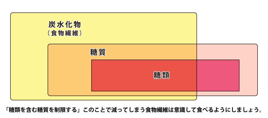 炭水化物の中でも易消化性炭水化物(人が消化吸収しやすく、4kcal/gのエネルギーを産生するもの)を糖質と分類され、難消化性炭水化物(人が消化吸収しにくい、エネルギーは0~2kcalと不安定なもの)その一部が食物繊維と呼ばれます。科学的に分類すると糖質には単糖類、二糖類、多糖類、糖アルコール、その他のものがあります。単糖類(ブドウ糖・果糖)と単糖類が2つつながったもの(ショ糖=ブドウ糖+果糖、麦芽糖=ブドウ糖+ブドウ糖、乳糖=ブドウ糖+ガラクトース)があり、糖質の内、単糖類と二糖類を総称として糖類と呼びます。オリゴ糖類は、少糖類で、単糖類が2~20個つながったものですが、オリゴ糖の多くは低カロリーで、ビフィズス菌の栄養源となります。