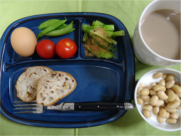 無脂肪、無糖のヨーグルトにはフルーツの代わりに蒸し大豆を50g加えます。前夜にゆでておいた卵(1日おきに食べます)スナップエンドウ、小松菜のいりごまのみの和え物(青菜は買った日に茹でて冷凍します)飲み物はカフェオレです。