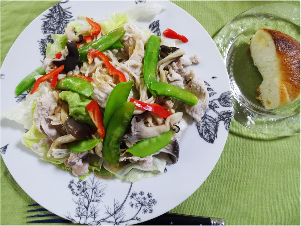1/3玉分のレタスと大量のエノキ茸、エリンギ、平茸と薄切りの豚肉をオリーブ油で炒めていりごまドレッシングを廻しかけます。彩に絹サヤとパプリカを散らしました。主食はチーズ入りベーグルを1/2個食べて、食後にリンゴを1/6個食べました。飲み物はコーヒー。