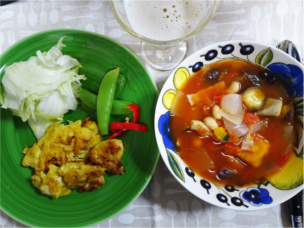 夕食は少し手をかけて、タンドリーチキンとカボチャ、ミックスビーンズ、エリンギ、タマネギ、ナスとベーコンを角切りトマト缶で煮込んだトマトスープ。白ワインの泡を少しだけ。