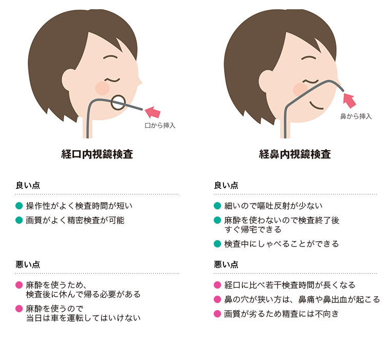 胃カメラを楽にうける方法には、経鼻内視鏡と鎮静剤を用いた経口内視鏡があります。経鼻内視鏡は径5mm強の細い内視鏡を鼻から挿入します。咽頭反射(おえっとなること)はほとんど起こらないので、鎮静剤は必要ありません。一方、経口内視鏡は約9mm程度の太さの内視鏡を口から挿入します。経鼻内視鏡とくらべ嘔吐反射がおこりやすいので、鎮静剤を使用します。鎮静剤を用いると、ほとんど眠っている間に検査が終了するので苦痛はありません。