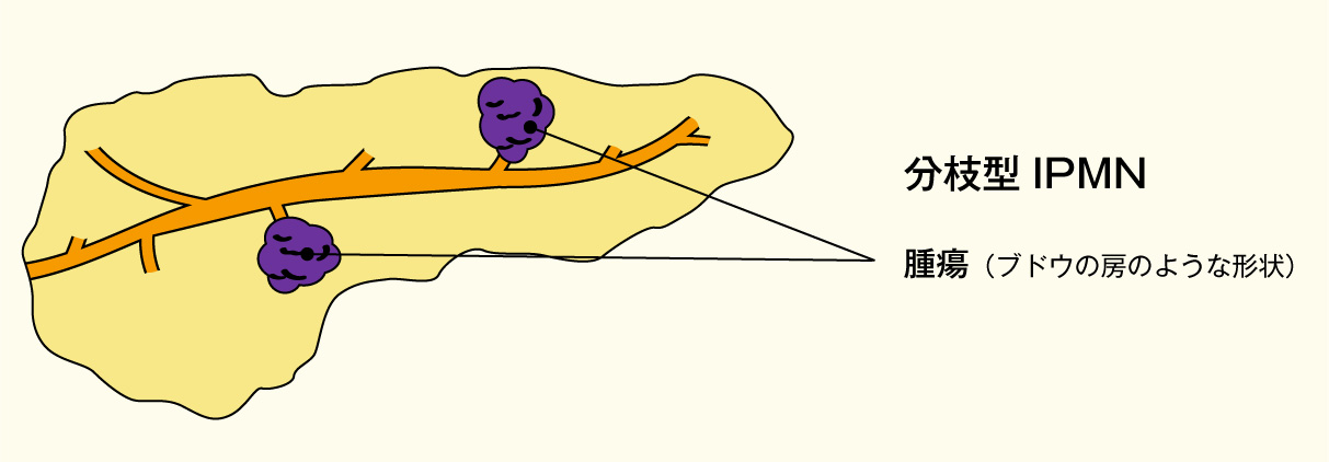 健診でたまたま見つかる嚢胞で圧倒的に多いのが腫瘍性嚢胞の膵管内乳頭粘液腫瘍、通称IPMNと言われるものです。その名の通り腫瘍の一種です。ただそれにも種類があります。膵臓のなかには膵管という膵液の通り道があり、幹に相当する「主膵管」から、枝に相当する「分枝膵管」が分かれています。主膵管から発生する腫瘍が主膵管型IPMN、分枝膵管から発生するものが分枝型IPMNです。