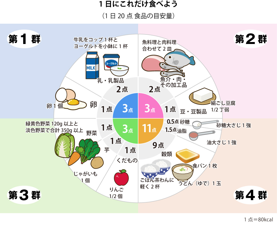 「四群点数法」は4つの食品群の中から、性別・年齢で食材の目安量が示されており、図2のように各食品群からの目安量を摂ると適量になるという食べ方です。