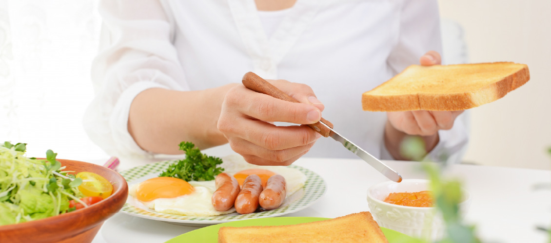 起床時の脳はエネルギーが枯渇した状態ですので、体を動かすためのブドウ糖が不足して、子供と同じようにだるさを感じたり、集中力がなくなってイライラしたりという事が起こるようです。また、朝食抜きで昼食を摂ると空腹の状態ですから、食べ過ぎや間食を摂ってしまう事にもなります。朝食を摂ることは太りにくい体を作ることにもつながります。