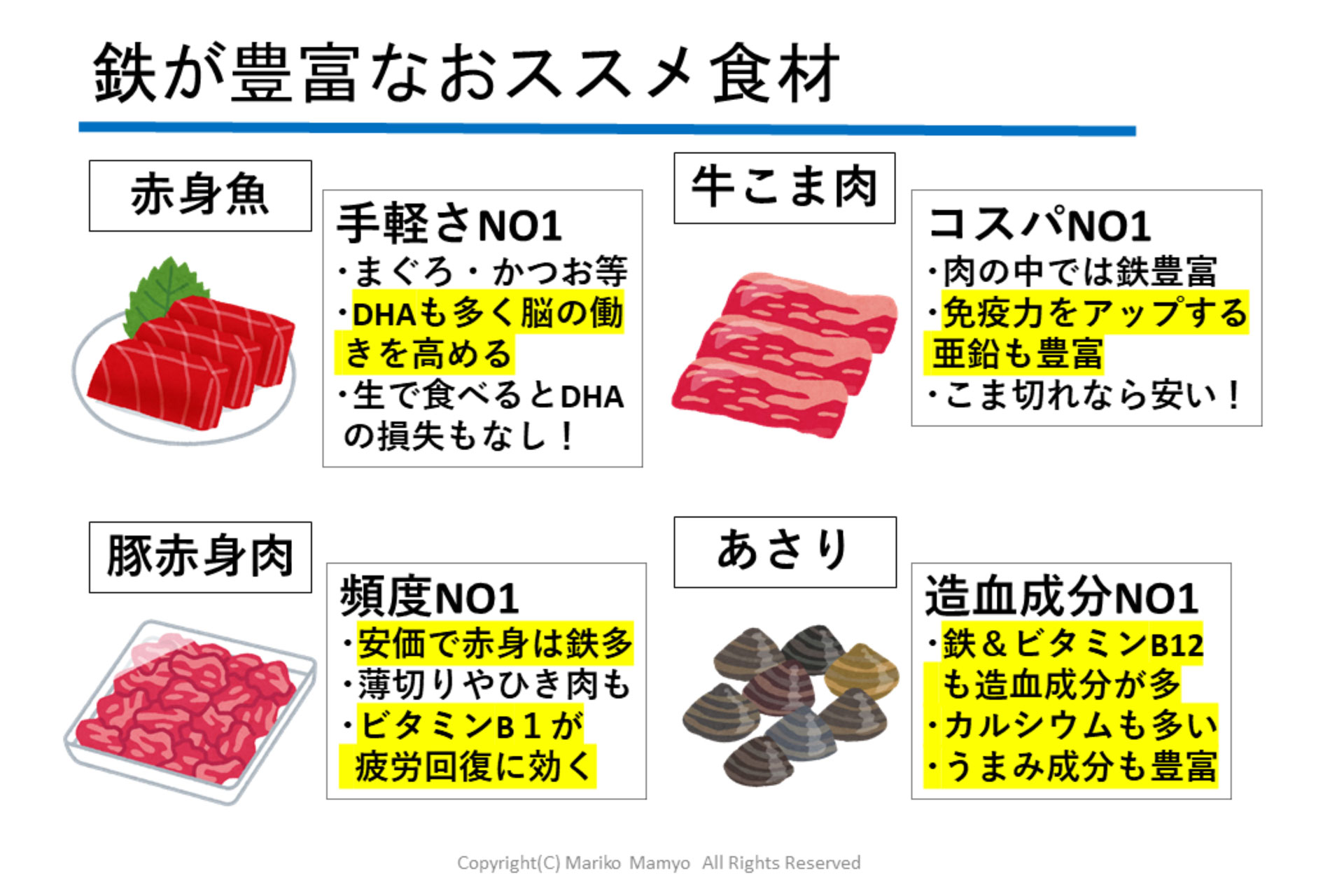 重度の貧血の場合、鉄剤が処方される場合もありますが、貧血の改善は基本的には「食事」です。貧血の程度にもよりますが、改善までに時間を要する場合がありますので「貧血にならない」ように食事も意識していくことが重要です。