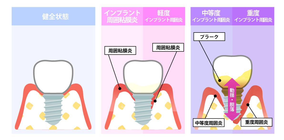 インプラントと被せ物をスクリューでネジ固定するのだが、ネジが緩むと隙間ができるため汚れと細菌がたまり、骨が溶ける。また被せ物の形態も誤ると汚れが溜まりやすくなる。