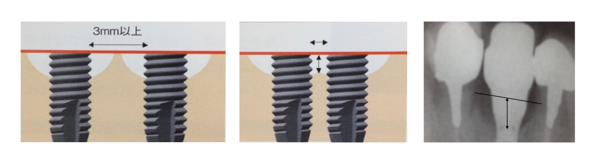 埋入後インプラントの周囲の骨は1.5mm吸収するため、深く埋入しすぎると垂直的に骨が吸収する。また隣の歯やインプラントに近接して埋入すると介在する骨が吸収する。
