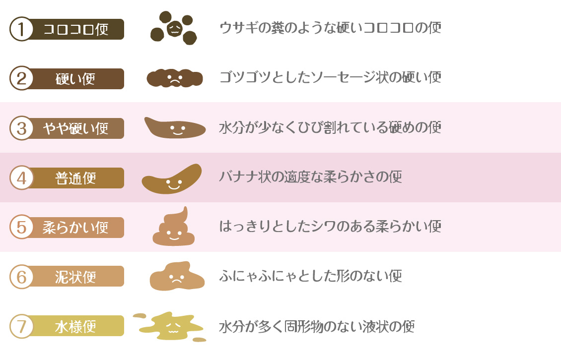 便の硬さと形状の目安として活用されているものに、図に示した「ブリストルスケール」という国際的に使用されている基準があります。便の状態で消化吸収や食事内容、腸内環境もチェックできることから便をチェックすることで、体調管理をするアプリもあり、「ウンログ」というアプリは活用しやすく、ポップでわかりやすいのでお勧めです。