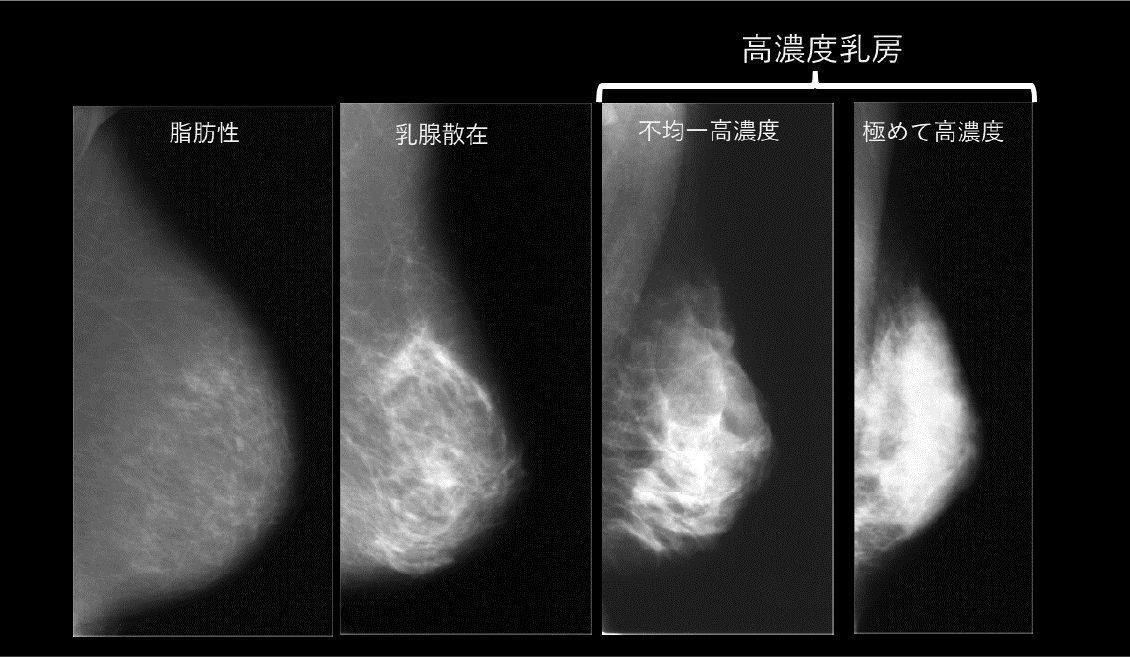 マンモグラフィを行った際、乳房内の乳腺の割合により『見え方』が違います。乳房は、主に乳腺組織と脂肪組織により構成されています。脂肪が多い人はマンモグラフィ検査で乳房全体が黒く写るので、白い塊として写る乳がんのしこりを見つけやすいです。一方、乳腺組織は白く写ります。乳腺組織が多い人のマンモグラフィでは乳房全体が白く写るため、白く写るしこりを見つけにくくなります。このように乳腺組織が多い場合を、「乳腺濃度が高い」と表現します。 乳腺濃度が高い順に「極めて高濃度」「不均一高濃度」「乳腺散在」「脂肪性」の4つのタイプに分かれます。
