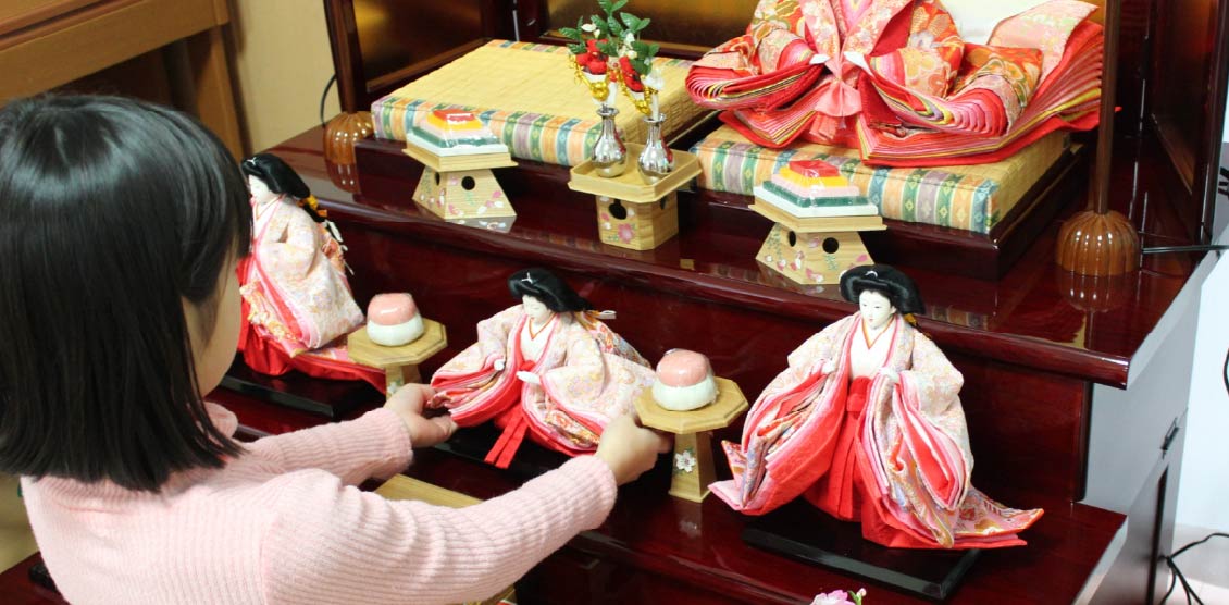 「ひなまつり」は、古くは中国で厄除けのために土や紙の人形を川に流す風習が伝わったもので、江戸時代以降に民間でも人形を飾って子供(女の子)の幸せを願う行事となりました。