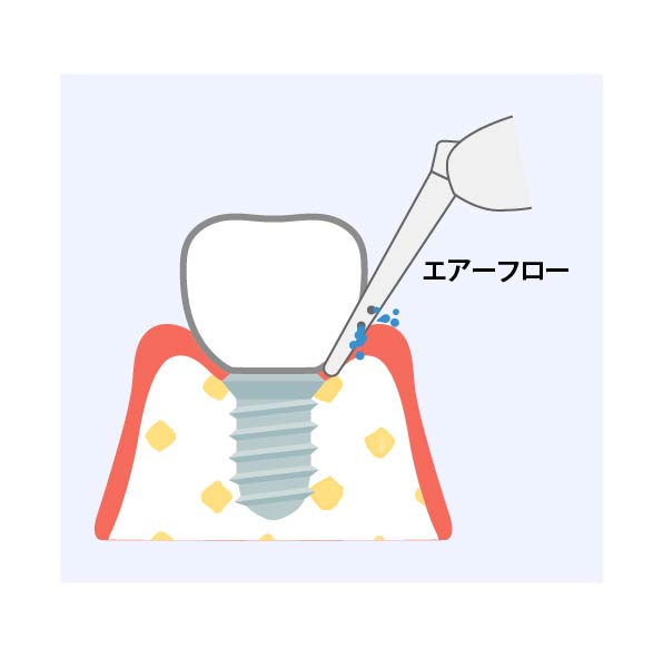 (2)インプラントと歯茎の隙間(歯周ポケット)を専用の器具(エアーフロー)を用いて、特殊な粉を水流で吹き付けて汚れを洗浄する