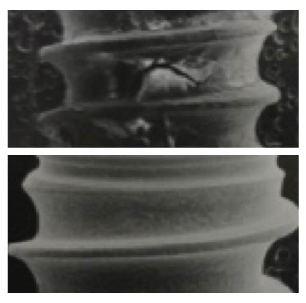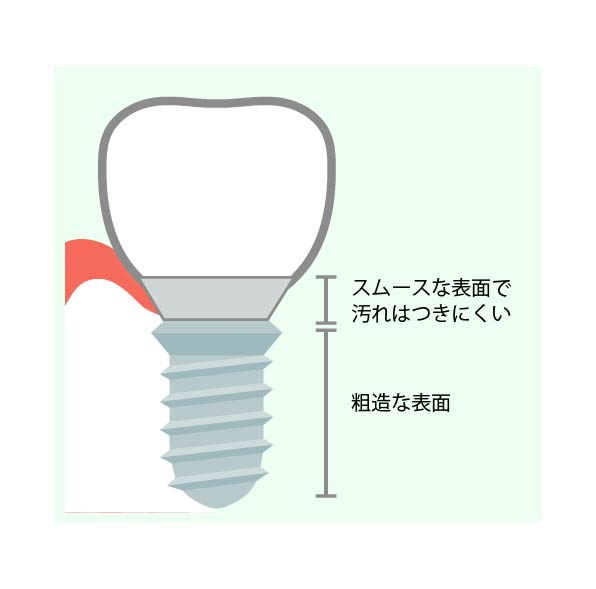 インプラント周囲炎は早めの対応をすることで、この粗造な表面が感染する前の軽度な状態で対応することが必要なので、定期的なメンテナンスが重要となる。