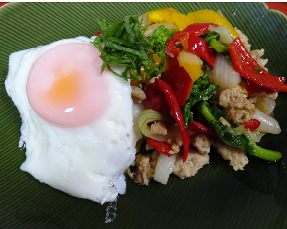 フライパンに油を熱して、ニンニクの香りを出します。そこへ鶏のミンチを加えて、刻んだ玉ねぎ、パプリカ、サッと茹でたなばなを加えて、ナンプラーとオイスターソースで控えめに調味します。辛いのが好きな方は唐辛子を加えても良いでしょう。ご飯に目玉焼きを加えて出来上がりです。直ぐに火が通るのであっという間に出来上がります。