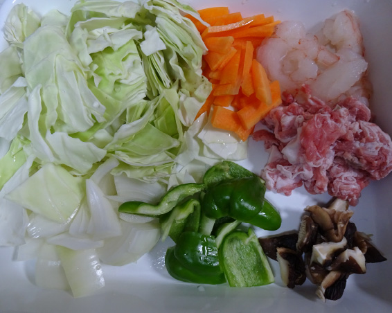 フライパンにごま油を入れ、しょうがの薄切りを加えて香りを立たせます。次に豚肉と大きめに切った野菜と戻した干しシイタケを加えて炒め、少ししんなりしたらむきエビ、調味料を加えて電子レンジで作った鶏ガラスープ100ccを加えます。片栗粉で少しとろみをつければできあがりです。