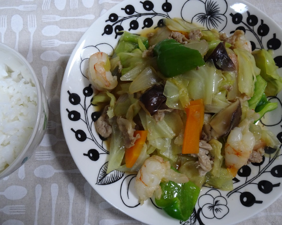 そこで、今度は八宝菜ならぬ五目炒めという感じですが、野菜を大きめに切って炒め煮にして、ご飯と別々に食べてみました。