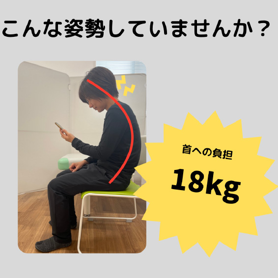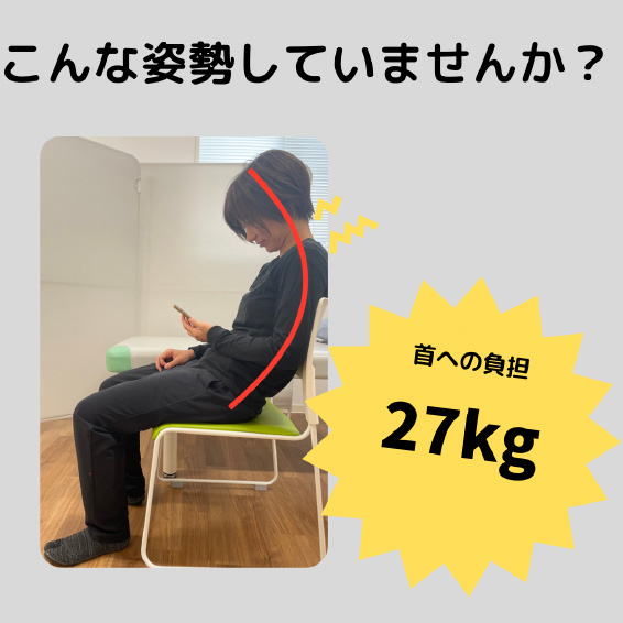 頭が前へ傾けば傾くほど首への負担は増大し、スマホ首(スマートホンを見る時のうつむき姿勢)では、最大約27kgもの力がかかっていると言われています。