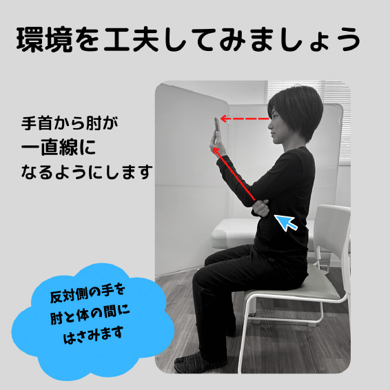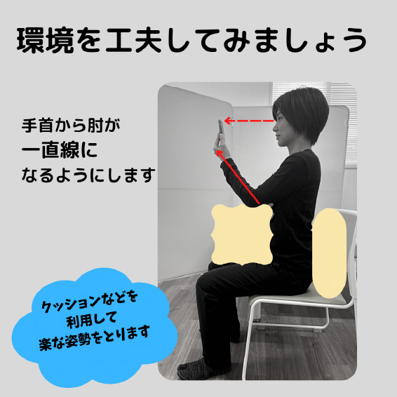 スマホや本など片手で持つ場合、手首から肘が一直線になるようにして目線が下向きにならないようにすると良いです。その際、反対側の手を肘と体の間に挟んだり、クッション等を利用したりして楽な姿勢をとると良いです。またパソコン作業の姿勢でも同様の事が言えるので、環境を見直すことも大切です。
