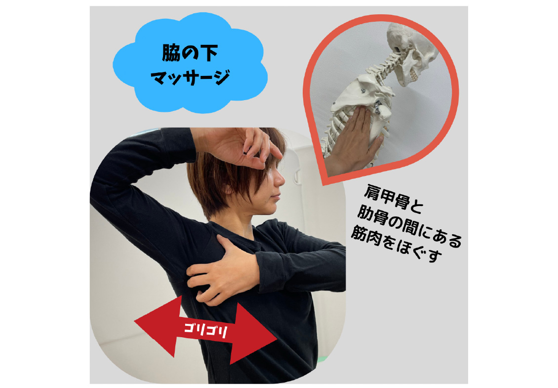 肩こりに効果があるストレッチでよく見かけるのは、「肩をすくめてストンと落とす」「腕をあげたり広げたりして伸ばす」などではないでしょうか。 私がお勧めするのは、「わきの下をさすって、ほぐす」です。