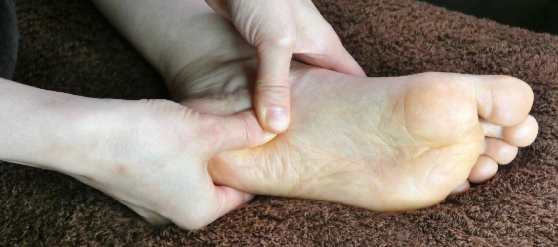足底腱膜炎は痛みがでる場所が特徴的です。足の裏のかかと部分、少し内側のあたりです。足の指を反らすと土踏まずのあたりで足底腱膜を確認できるので、それをかかとのところまで追っていくとわかりやすいと思います。そこが足底腱膜のかかとの骨に付く場所で、押されたり歩いたりした時に痛い場合は、足底腱膜炎の可能性が高いといえます。