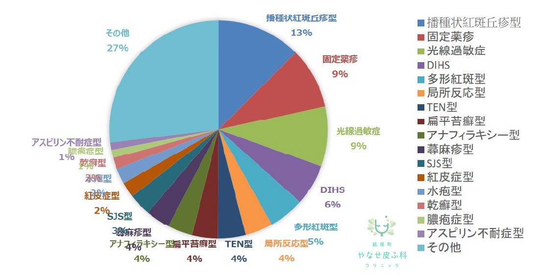薬疹で最多の病型が紅斑丘疹型薬疹で、次いで固定薬疹型や光線過敏症型、多型紅斑型との報告があります。