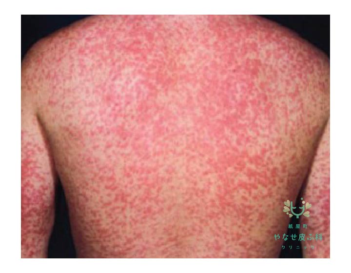 症状はいつからどのように広がっていったか、また発熱の有無や唇やまぶたなどの粘膜のただれがないか丁寧に確認する必要があります。鑑別として、麻疹(はしか)や風疹(三日ばしか)、ほかに溶連菌感染症などの感染症に伴う中毒疹などが挙げられ、臨床症状や熱の経過、採血結果などから総合的に判断が必要です2)。