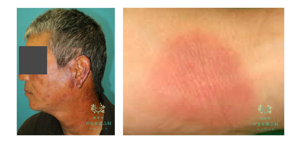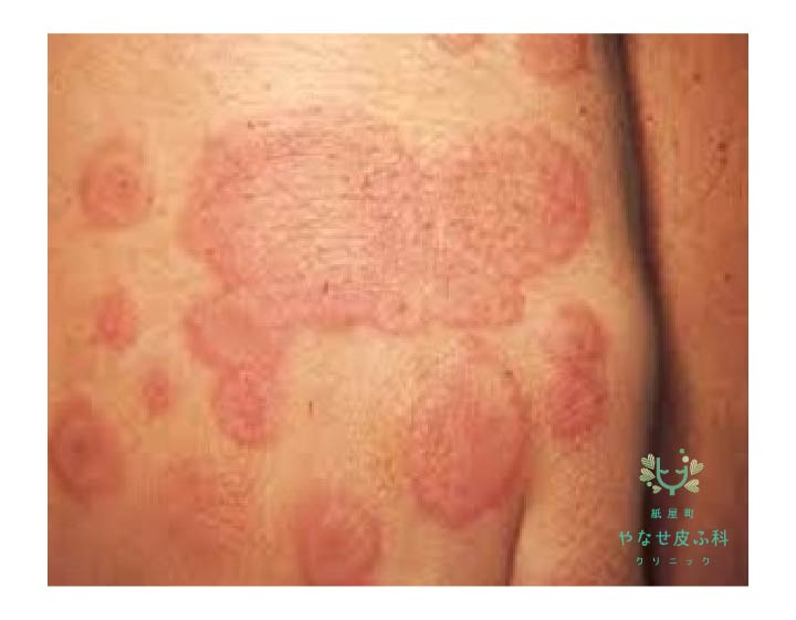 多型紅斑型薬疹は標的病変と呼ばれる大小さまざまな浮腫状の二重発赤が多発する病型で、紅斑丘疹型薬疹と同様の薬剤による報告が多くなされています。