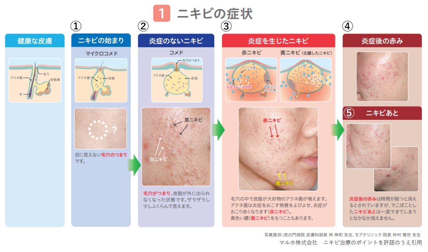にきびを治療したのちも、④炎症後紅斑と呼ばれるにきびの赤みや、⑤ニキビのへこんだ傷あとに悩まされることもあります。