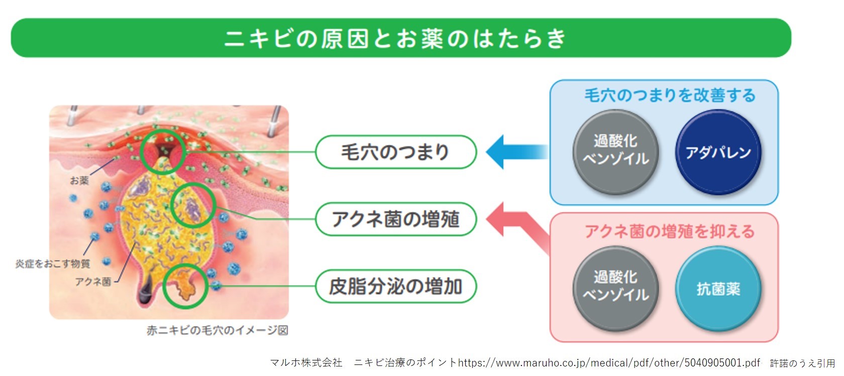 そののちに、医師に処方された塩化ベンゾイル製剤(ベピオ®ゲル)やアダパレン(ディフェリン®ゲル)をお顔全体に塗布し、赤いにきびには抗菌剤(ゼビアックス®ローションなど)の部分的な外用を行います