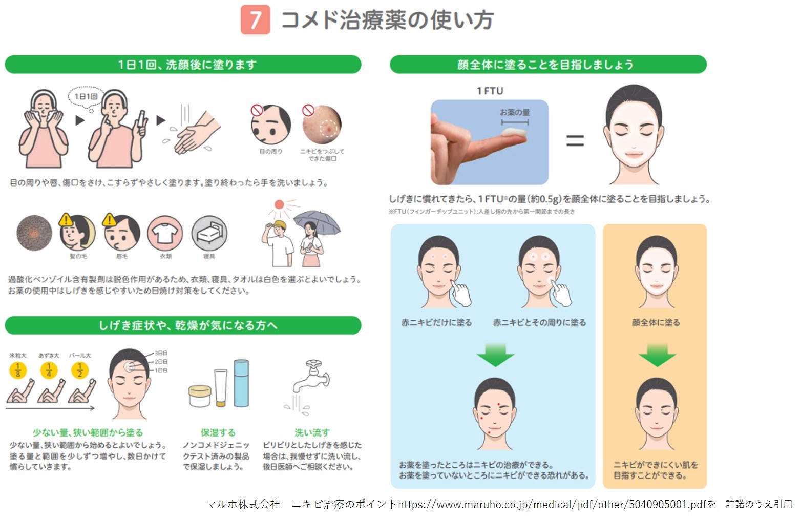 アダパレンや塩化ベンゾイル製剤はニキビ治療ガイドラインで推奨度がAとされる薬剤で1)、これらはマイクロコメド、つまり発症初期のにきびから抑えることができるため、全顔に塗布する必要があります。