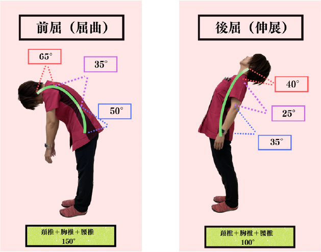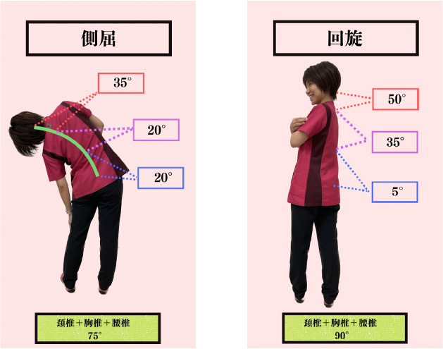 下記のように、頚椎・胸椎・腰椎はそれぞれ動かせる範囲があります。