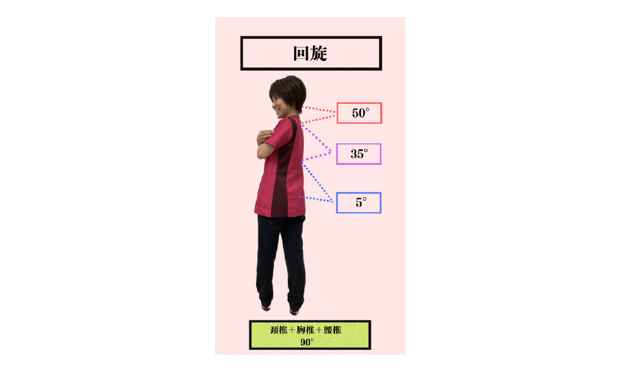 「頚椎+胸椎+腰椎」の回旋角度(③)は、90°となっていますが、腰椎のみの回旋角度は5°となっています。実は腰は捻ることがあまり出来ない構造となっています。