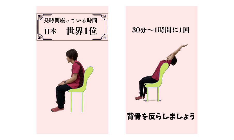 勉強やデスクワークなどで座っている作業の合間に背骨を反らすことで、前傾姿勢をリセットします。理想は30分~1時間おきに1回、行いましょう。
