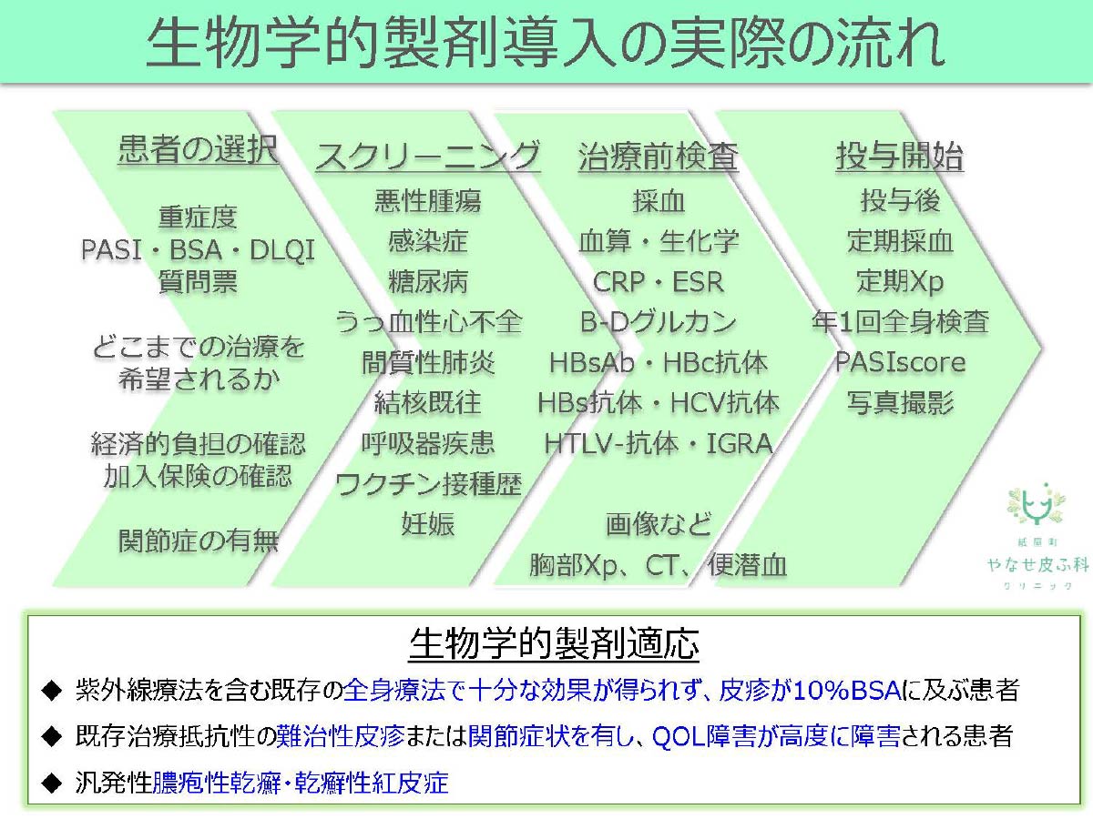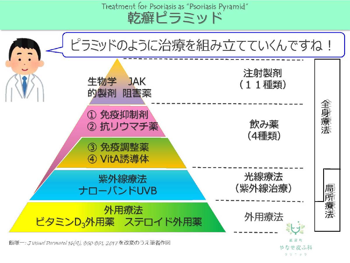 乾癬治療はガイドラインに沿って、まずはステロイドやビタミンD製剤の外用を丁寧に行います。皮疹が広範囲に及ぶ場合や重症度が高い場合、関節痛を伴う場合などは免疫抑制剤(ネオーラル®︎)、免疫調整剤(オテズラ®︎)、メトトレキサート(リウマトレックス®︎)の内服や、生物学的製剤(トルツ®︎やルミセフ®︎、トレムフィア®︎など11種類)から合併症や既往歴、病態や注射の方法などから患者さんと相談のうえ主治医が総合的に判断します[図 3]。