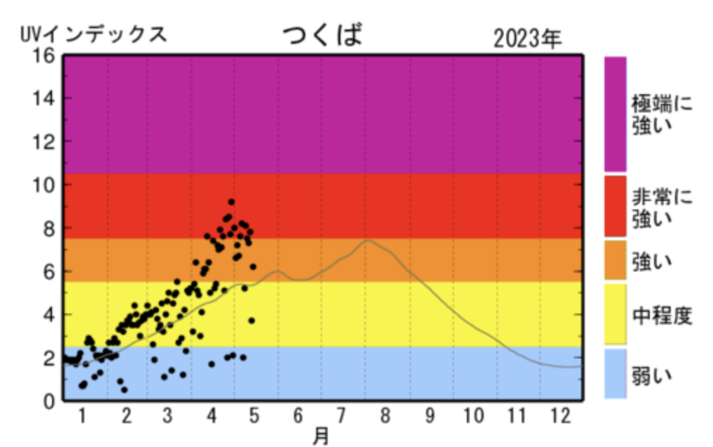 気象庁が紫外線の強さと人体に及ぼす影響の度合いを指標化した「UVインデックス」によれば、3~4月頃から「中程度」のレベル3~5、5月になるとレベル6以上の「強い」となっています。