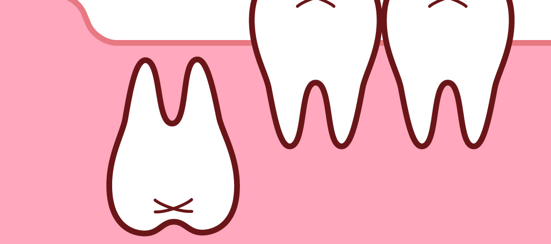 親知らずは医学的に「第三大臼歯」と呼ばれ、基本的にはその他の永久歯と同じ扱いを受けていますが、実際は異なる点が多く、親元から離れる20歳前後に生えてくることから「親知らず」という変わった名前で呼ばれるようになりました。前から7番目の第二大臼歯は、12歳くらいの生えてくるため、親知らずが生えてくる頃には永久歯列が完成し、顎の骨の成長も止まっています。その状態で親知らずが生えてくると、多くのケースでスペース不足が生じます。スペースが足りなないと、上段で解説したような異常な生え方をしてしまうのです。