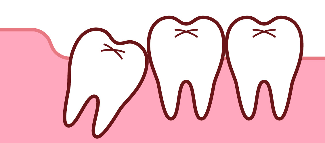 親知らずが斜めに倒れ込んでいたり、横を向いて生えていたりするタイプは、トラブルの原因となりやすいです。こうした親知らずは、清掃性が悪く、歯周病や虫歯のリスクが高くなっている点に注意しましょう。手前の歯を圧迫して不要な負担をかけるケースもあります。あなたの親知らずがこのタイプであれば、小まめに経過を見ていく必要があります。