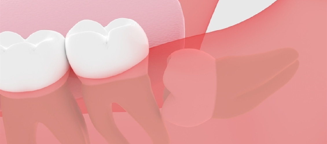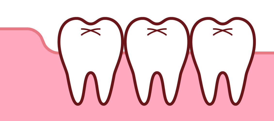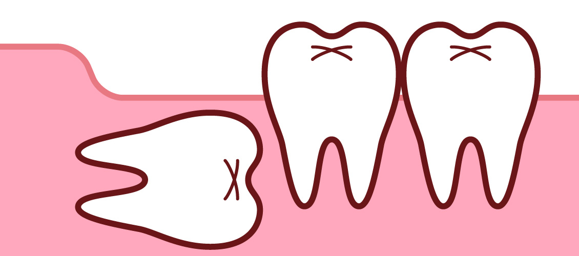 親知らずが歯茎の中に埋まっていて、口腔からは何もないような状態に見えるタイプです。過去に、歯科でパノラマ撮影を行ったことがない方は、その存在にすら気付いていないかもしれません。このタイプは、ある日突然、歯茎から頭を出してくることもあれば、一生涯、埋まったままのこともあります。