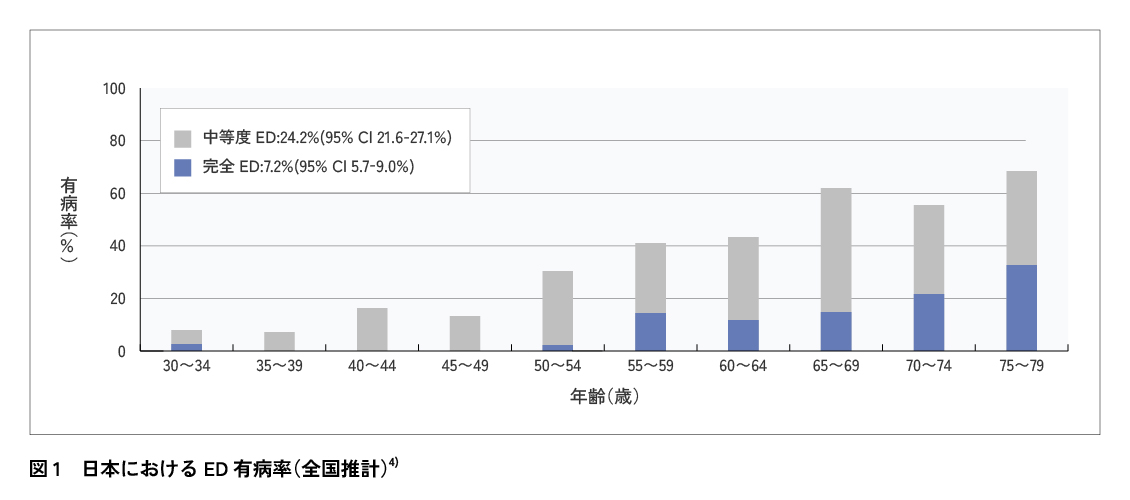 EDに悩む男性は、年齢が高くなるほど増加する傾向にあります。市販でED治療薬を購入することはできないため、症状が気になる方は泌尿器科で相談しましょう。