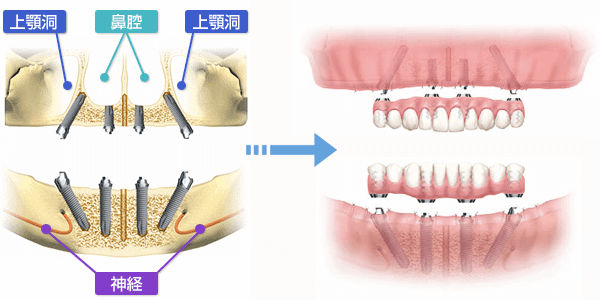 All on 4®以外の一般的なインプラントの場合は、奥歯にもインプラントを埋め込む必要がありますが、神経や血管が近くにある場合は、上顎洞を持ち上げる手術をしたり、骨の移植を行って骨を増やしたりします。しかし、All on 4®はそもそも神経・血管を避けてインプラントを埋め込むため、これらの追加手術が不要となります。