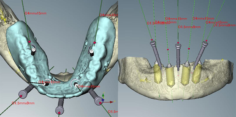 インプラントを傾斜させて神経、血管を避け、強固な骨の部分にインプラントを埋入し、尚且つ、即時荷重ソリューションを達成するには以前紹介したシミュレーションソフトを用いたガイドサージェリーが必要不可欠になります。