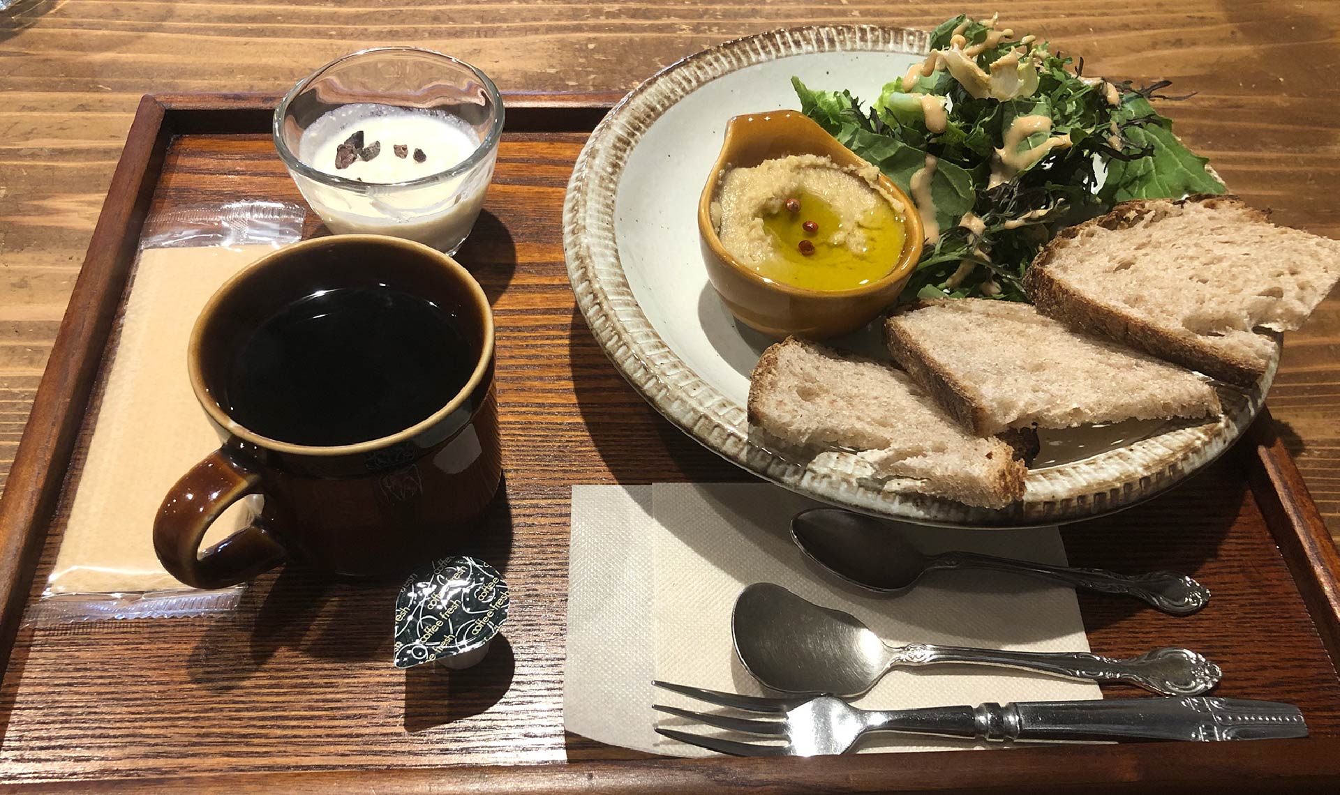 写真は朝限定の『ヴィーガンサラダセット』。日替わりのお野菜と、レンズ豆のムフスとパン、奥に見えるヨーグルトは牛乳ではなく豆乳を使用しています。コーヒーもオーガニック栽培で作られたコーヒー豆から、丁寧に抽出しています。