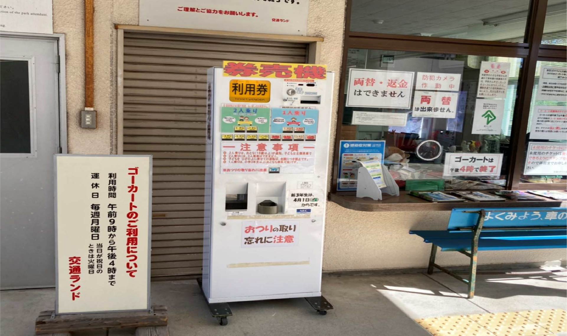 公園の入り口には、券売機が設置してあります。ゴーカートの料金は1人乗り100円/回、2人乗り150円/回です。ゴーカートが目的なら、乗車券を購入して園内へ向かいましょう。