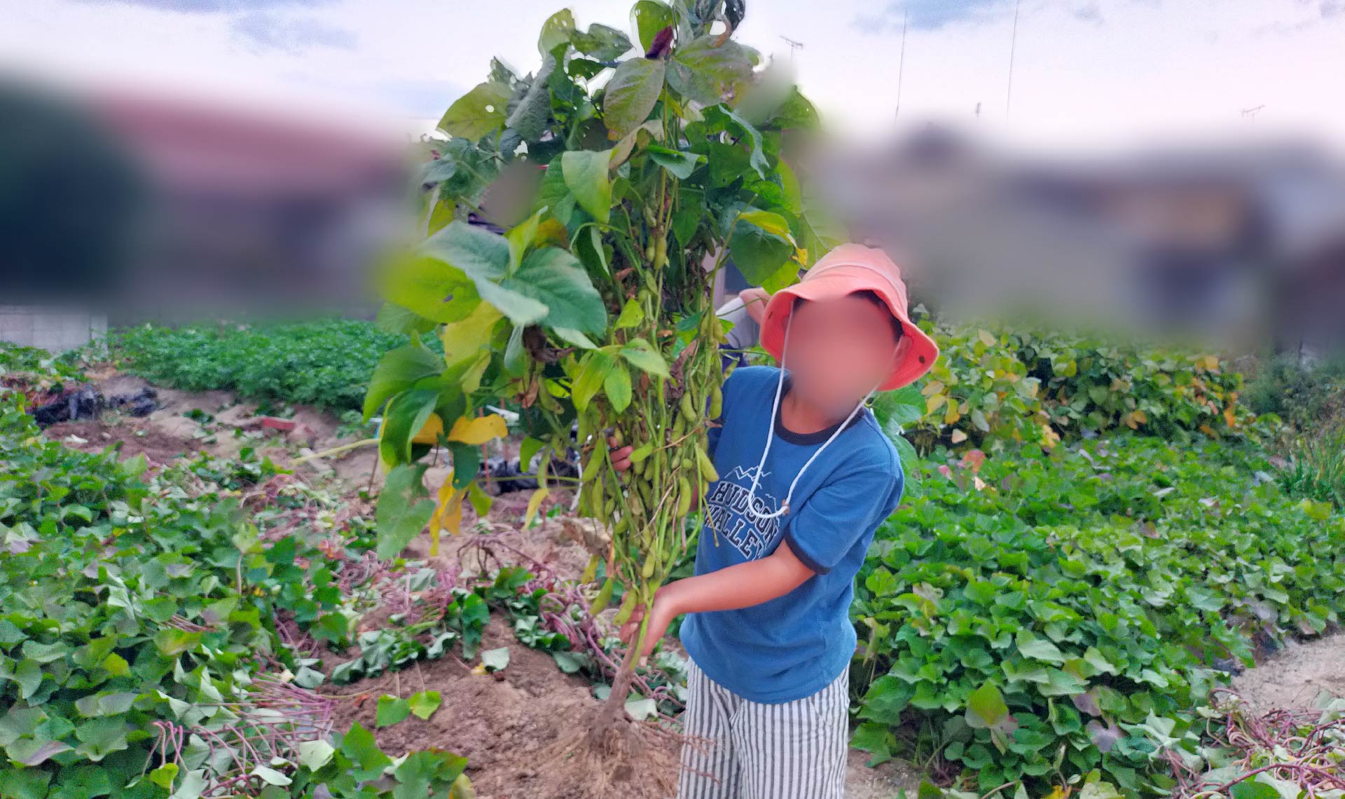 広島市内から少し離れた住宅地に、その畑はあります。秋になると、太陽をたっぷりあびたサツマイモ、ジャガイモ、エダマメの葉が、緑のじゅうたんのようになりました。