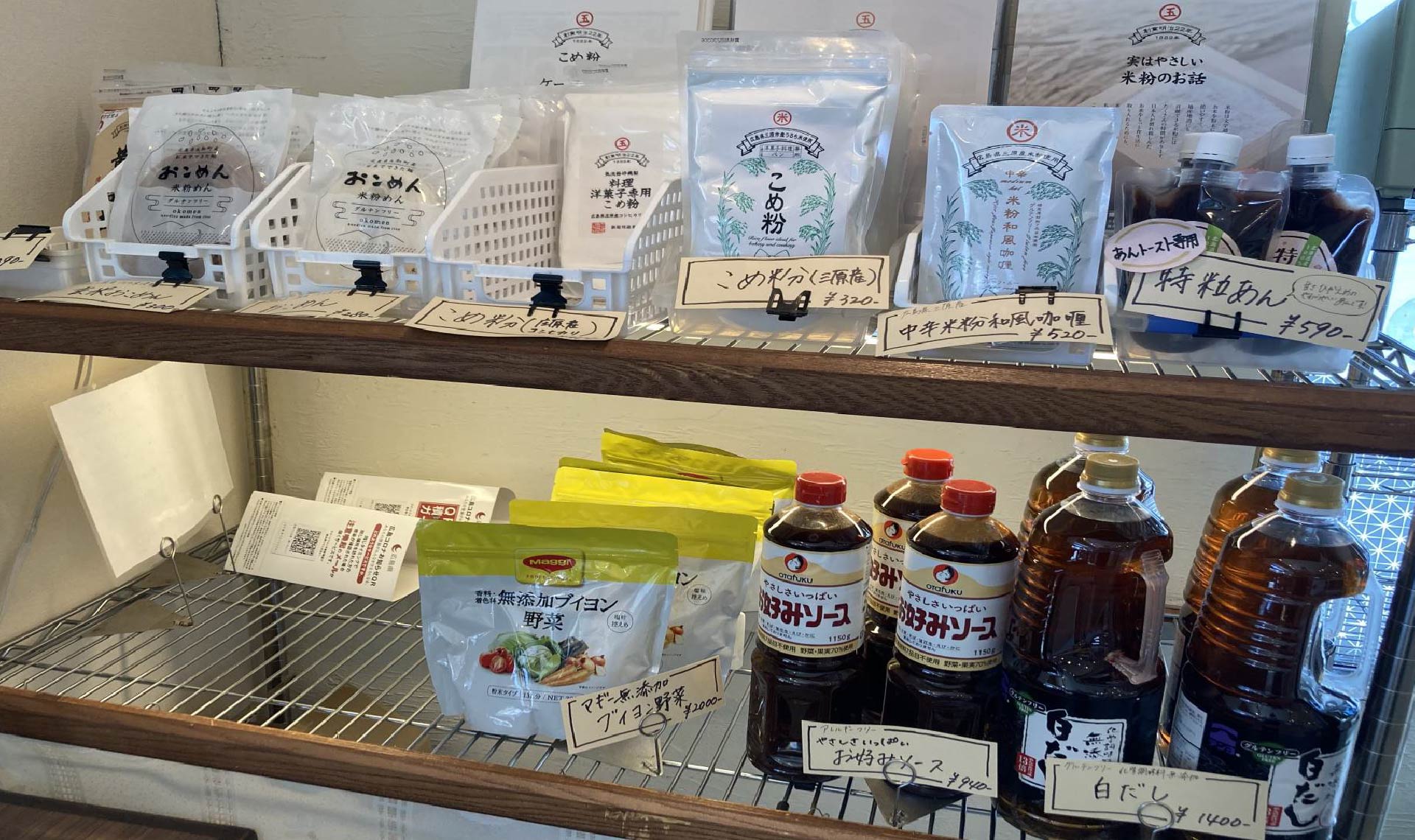お店の一角には、広島県産の米粉や、米粉を使った「おこめん」やレトルトカレー、グルテンフリーの白だしなども陳列されています。パン以外の食品でもグルテンフリーに取り組みたい方は、チェックしてみましょう。